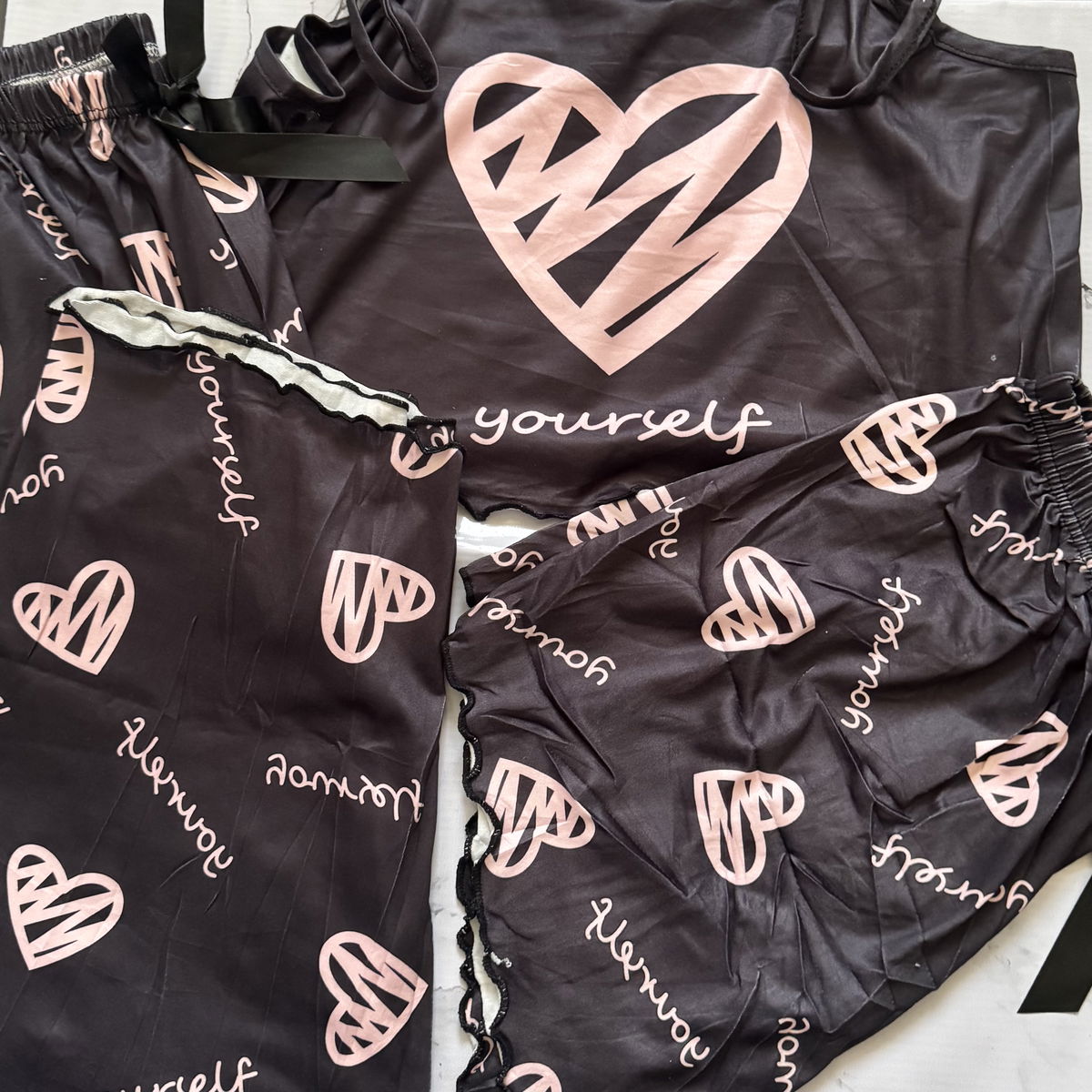 Pijama de tres piezas versátil y cómodo para todo el año. Con un pantalón largo, un pantalón corto y un top, puedes adaptarte a cualquier estación del año. Perfecto para invierno con calefacción o verano, este pijama te brinda comodidad y flexibilidad. Y lo mejor de todo: a un precio superaccesible. Modelo disponible en talle M/L