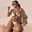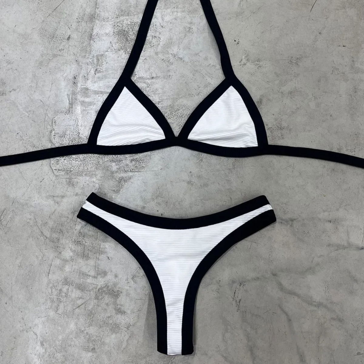 Esta bikini combina simplicidad y estilo con un diseño clásico de top triángulo y bombacha estilo less, confeccionados en una tela con sutil textura acanalada. El contraste entre el blanco y el borde negro le da un toque moderno y elegante que realza la figura.