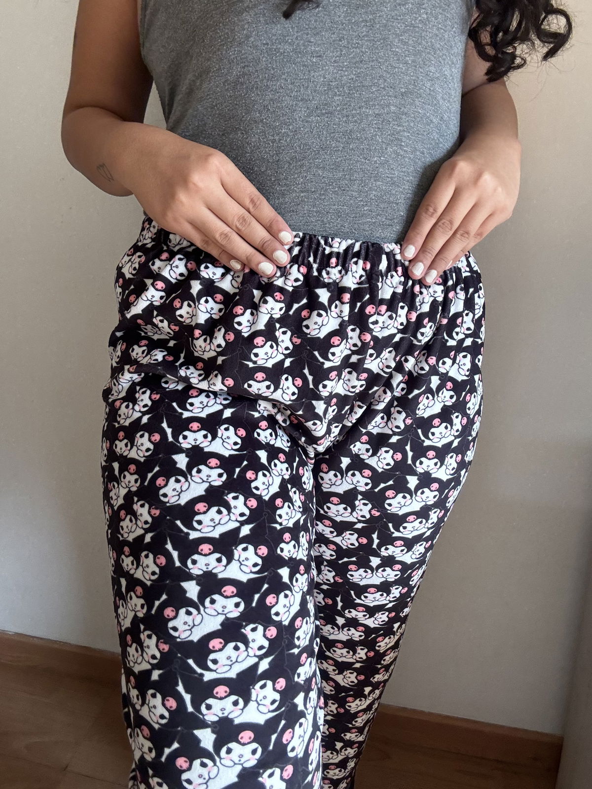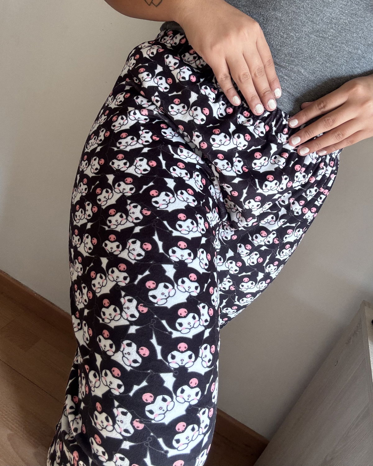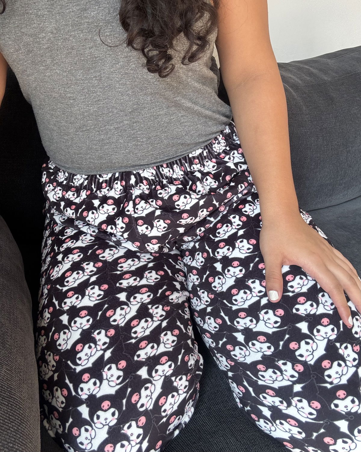 ¿Fan de la actitud de Kuromi? Estos pantalones son la mezcla perfecta entre lo gótico y lo tierno. Con un estampado tupido de la villana más querida de Sanrio sobre un fondo negro, este diseño captura toda su esencia: traviesa, coqueta y súper cómoda.