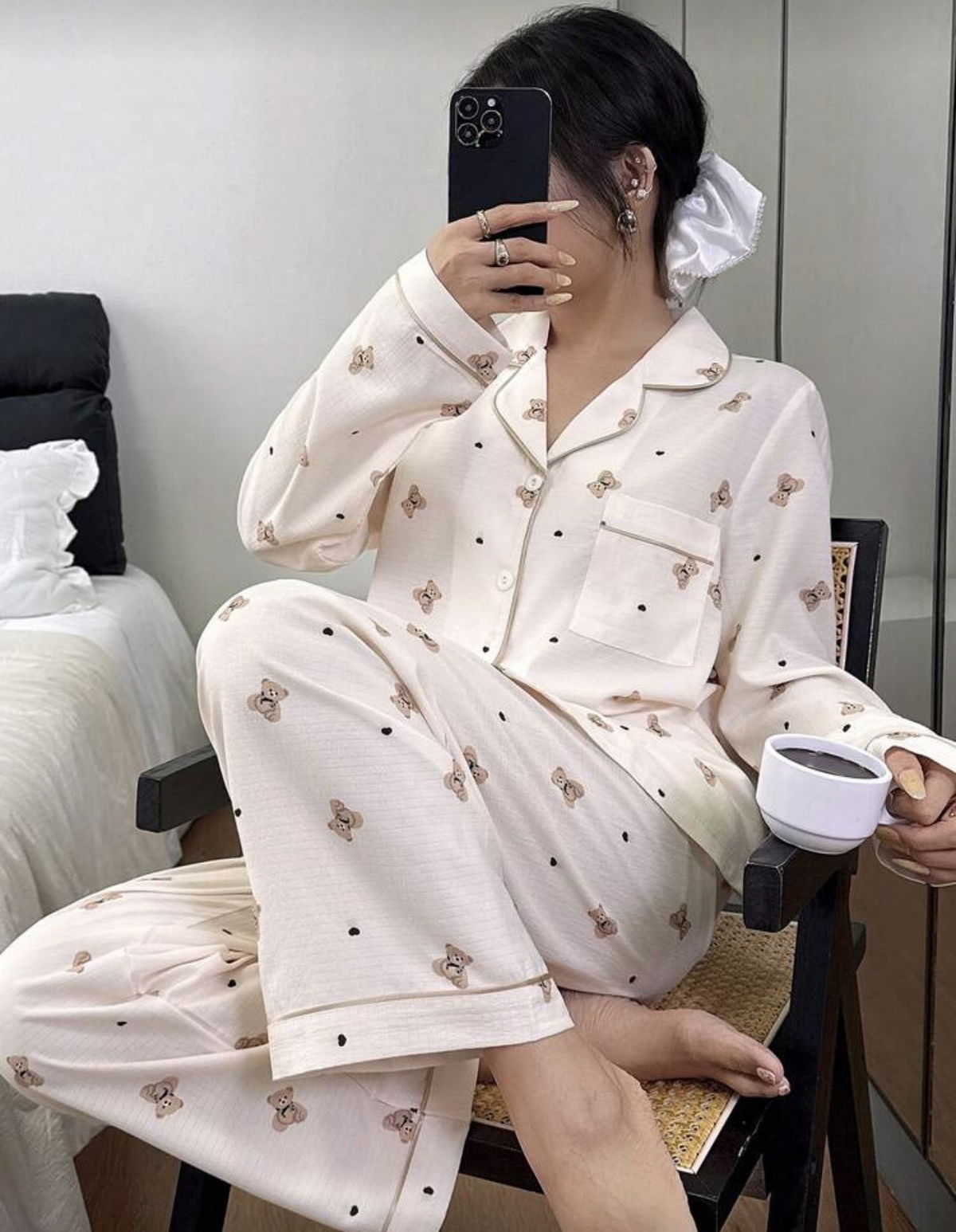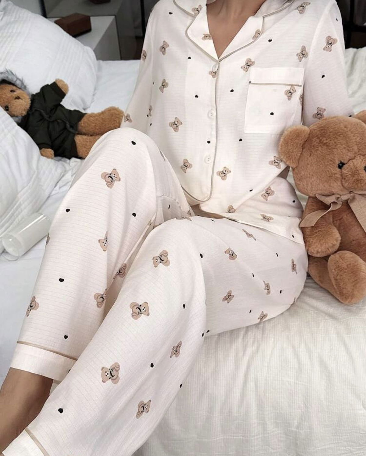 Disfruta de un descanso superior con este pijama de dos piezas. Confeccionado en algodón de alta calidad con una textura sutil, ofrece transpirabilidad y suavidad al tacto. El diseño clásico incluye botones frontales, cuello con solapa y ribetes en contraste, todo adornado con un adorable estampado de ositos🧸